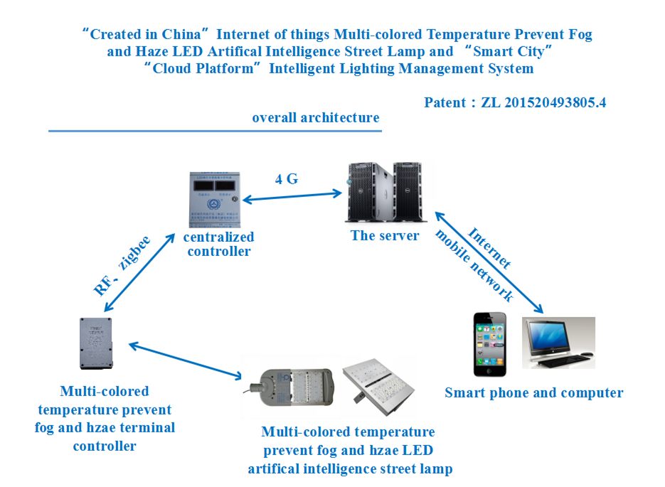 The mainly hardware of “smart city” “cloud platform” intelligent lighting management system is including the “intelligent centralized controller” “intelligent terminal prevent fog and haze, brightness adjustable controller” “multi-colored temperature prevent fog and haze, brightness intelligent remote regulating LED artificial intelligent street lamp”, etc. Includes time, preset, automatic remote control and other control mode. On the basis of ordinary monochromatic LED street lamp, using the Internet, 4G mobile communication, wireless communication technology, remote wireless intelligent control system, by the server for centralized controller issued a command, centralized controller logarithmic kilometers inside each terminal controller to interconnect each other, to achieve every single light color temperature, brightness remote setting, prevent fog and haze, remote monitoring and alarm, etc. At the same time, it can collect the datas such as PM 2.5, temperature, humidity, voltage, current, traffic, anti-theft image and video automatically, provide this public data information for meteorology, traffic, security and other departments and have smart car charging and electricity billing capabilities.